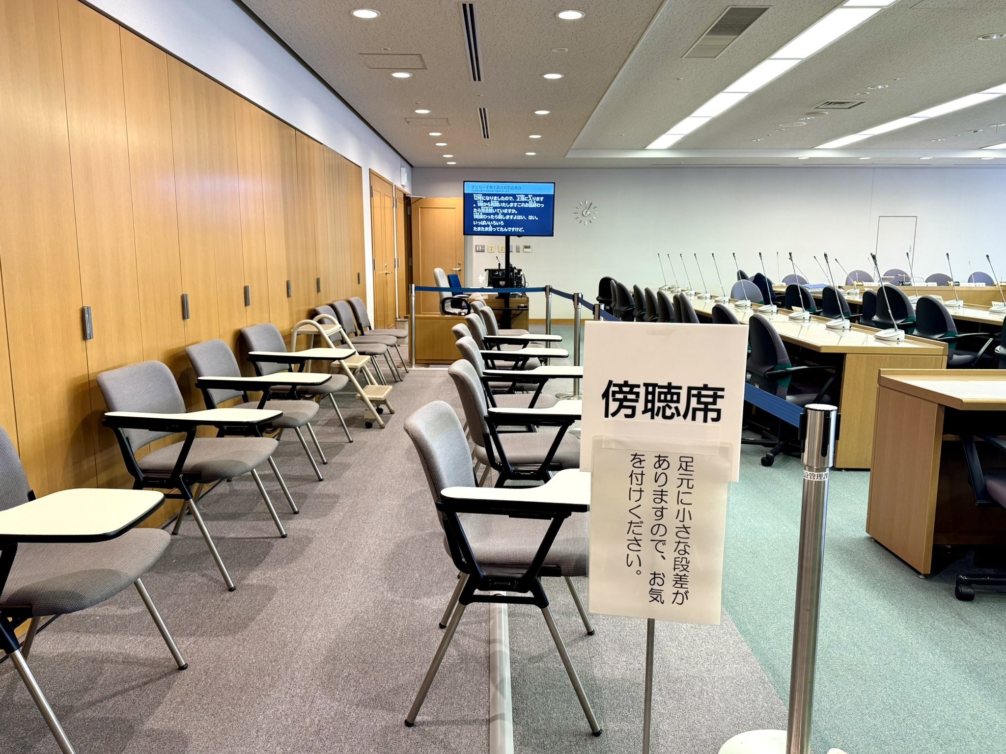 9. 2025年5月定例議会から、委員会室の傍聴席にリアルタイム字幕モニターとヒアリングループを設置したため座席が25→16席に減りましたが、別に車椅子スペースもあります。